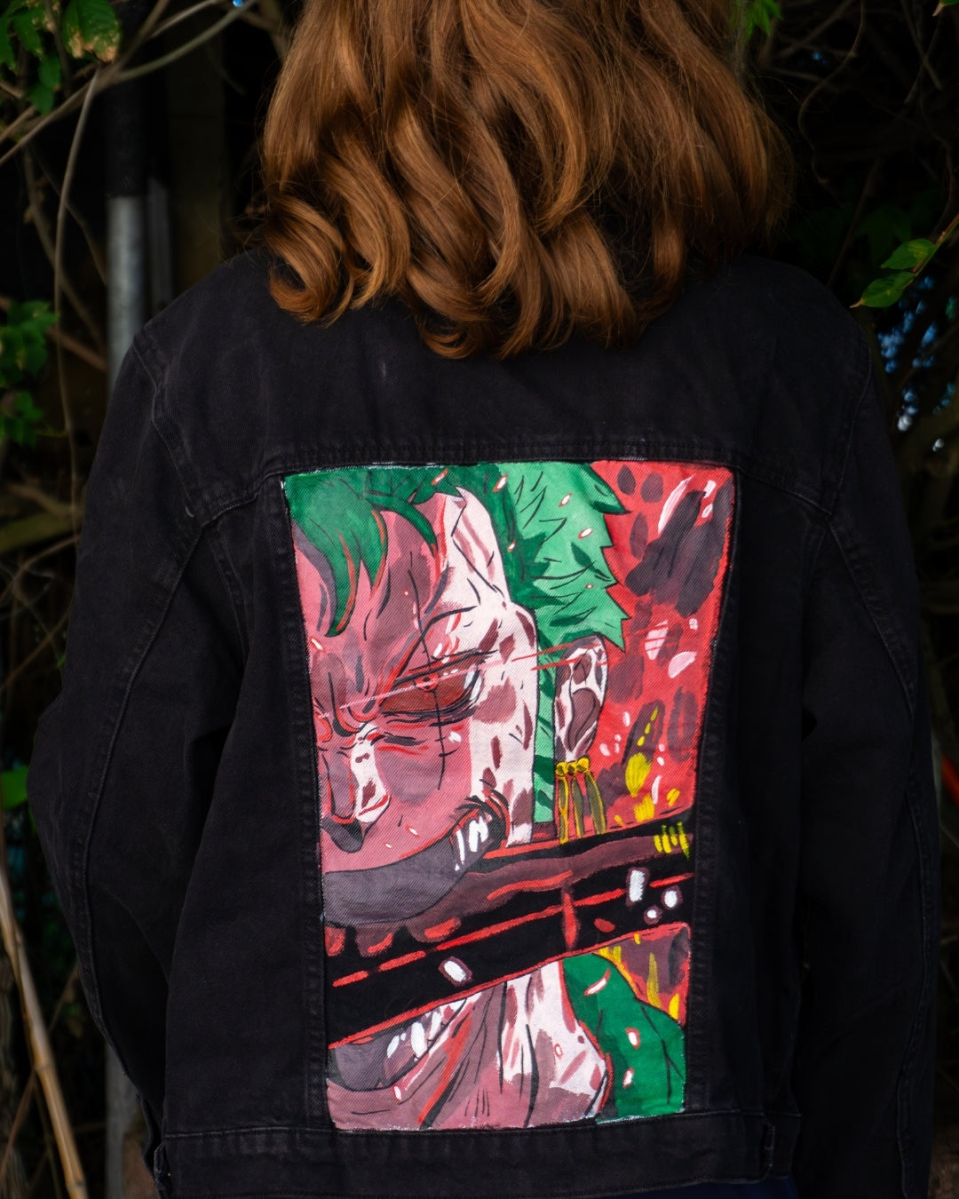Porta sempre con te lo spirito indomabile di Roronoa Zoro con questa giacca in denim nera di seconda mano, ridipinta a mano sul retro con un’illustrazione unica e dettagliata. Un capo d’abbigliamento sostenibile che unisce stile, arte e passione per One Piece.