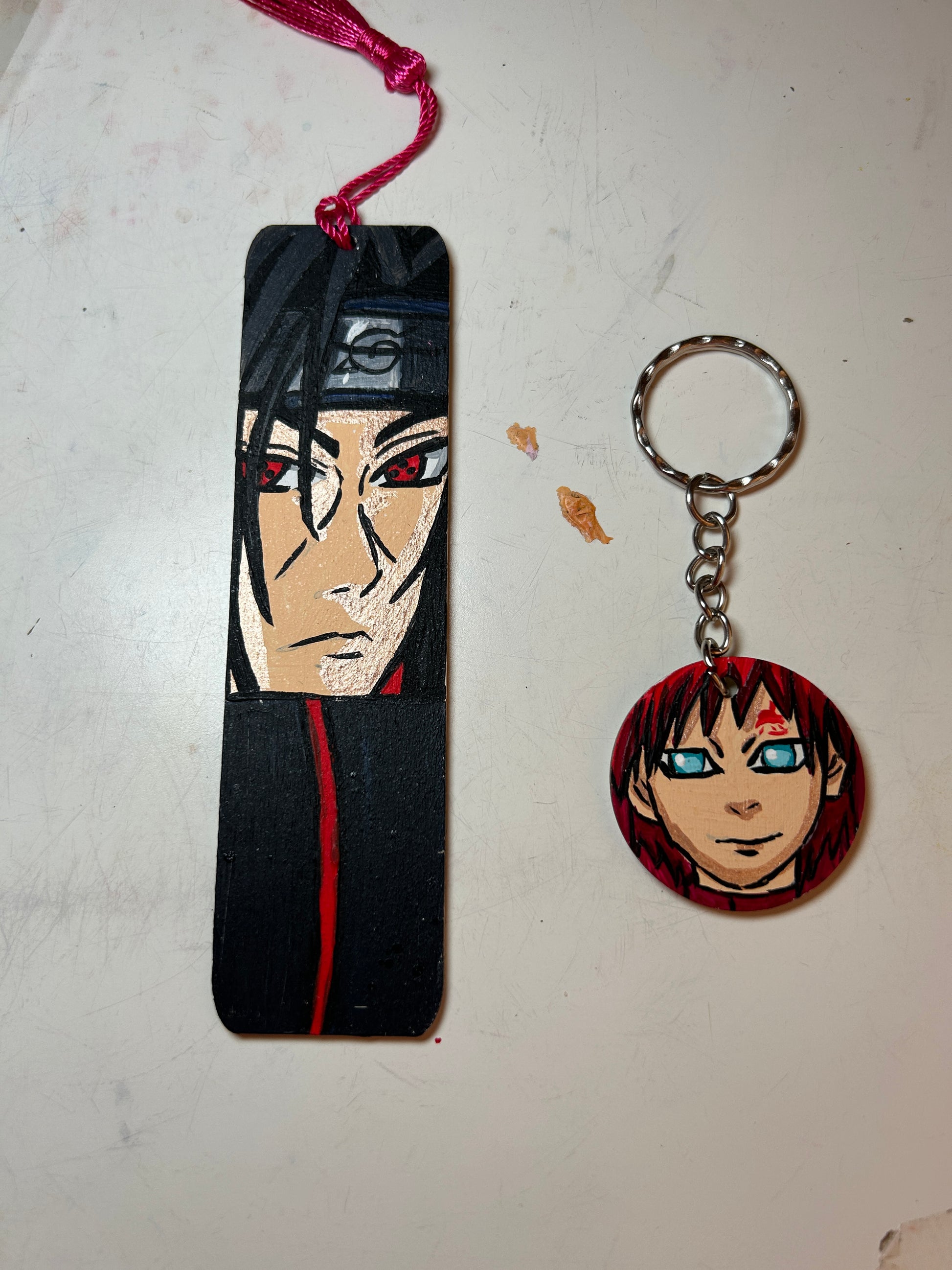 Segnalibro dipinto a mano con il motico e misterioso Itachi Uchiha accompagnato dal portachiavi dipinto a mano a tema Gaara.